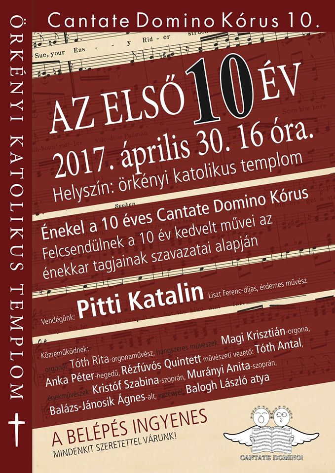 Nagy szeretettel ajánljuk minden zenét szerető ember figyelmébe az örkényi római katolikus templom Cantate Domino Kórusának 10 éves jubileumi hangversenyét.