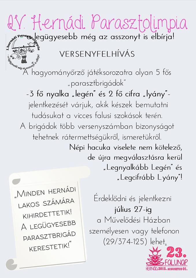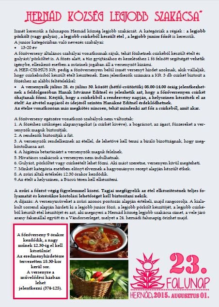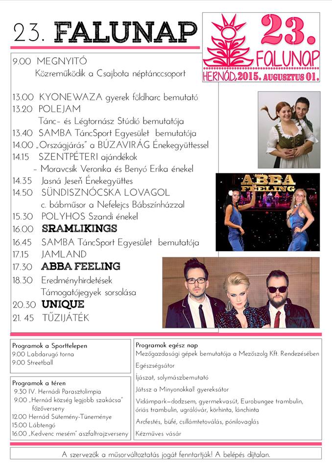 Augusztus 1-jén rendezzük meg 23. falunapunkat, amelynek programját és versenyeinek kiírásait a kis képekre kattintva olvashatják el. Várunk mindenkit!