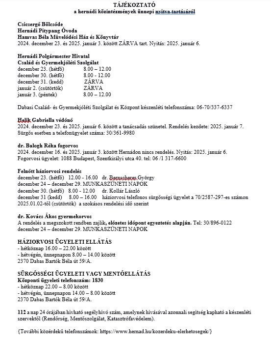 BystxTisztelt hernádiak! Tájékoztatjuk Önöket, hogy Dr. Kollár László háziorvos 2024. június 3-ától (hétfő) június 6-áig (csütörtök) szabadságon lesz. Helyettesíti Dr. Bernscherer György a saját rendelési idejében, a Hernád, 2. számú Háziorvosi Rendelőben. Köszönjük a türelmüket!