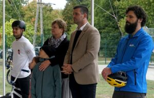 velünk volt a támogatót képviselő Töli Gergely, az Aktív Magyarországért Felelős Államtitkárság Bringaparkokért Felelős munkatársa, aki nagyon stílusosan biciklis szerkóban jött, Feldman László, Dabas Város alpolgármestere, Pichler Róbert, a kivitelező Görpark Kft. ügyvezetője és Bábel Jani extrémsportoló, aki igazán tudja, hogyan kell ezeken a pályákon repeszteni.