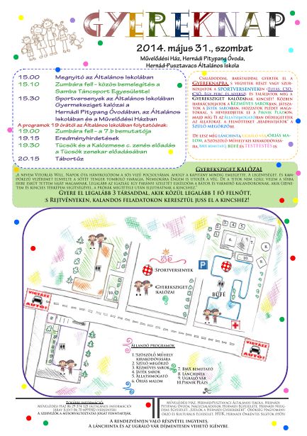 Május 31-én délután gazdag gyermeknapi programmal várják a gyerekeket és szüleiket az iskola, óvoda és a művelődési ház környékén. Jöjjenek el minél többen!