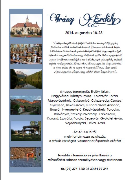 Az erdélyi kirándulásra igen korlátozott számban még lehet jelentkezni a plakáton jelzett telefonszámokon.