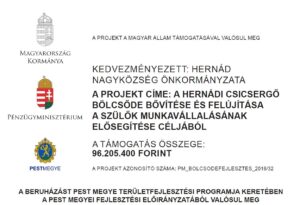 Hernád Nagyközség Önkormányzata 2018-ban pályázatot nyújtott be az Önkormányzati tulajdonú bölcsődei ellátást nyújtó intézmények fejlesztésének támogatása címen meghirdetett pályázati felhívásra a hernádi Csicsergő Bölcsőde bővítése és felújítása tárgyában. A sikeres közbeszerzési eljárás után 2020 márciusában a bontási munkákkal megkezddődtek a kivitelezési munkák. A beruházás során