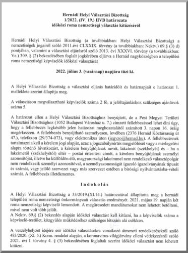 A Hernádi Helyi Választási Bizottság határozata a roma nemzetiségi képviselők időközi választás kitűzéséről (pdf)