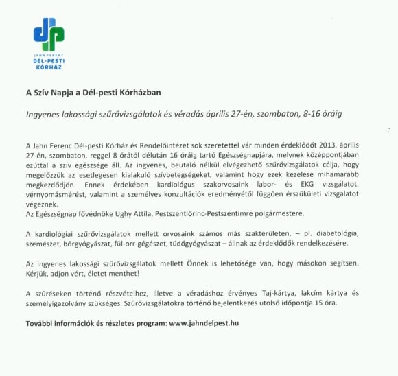 Április 27-én 8 és 16 óra között ingyenes lakossági szűrővizsgálatokkal várják az érdeklődőkat a Jahn Ferenc Kórházban. Ezen idő alatt véradásra is lehetőség nyílik. Kattintson a képre és olvassa el a kórház közleményét a részletekről!