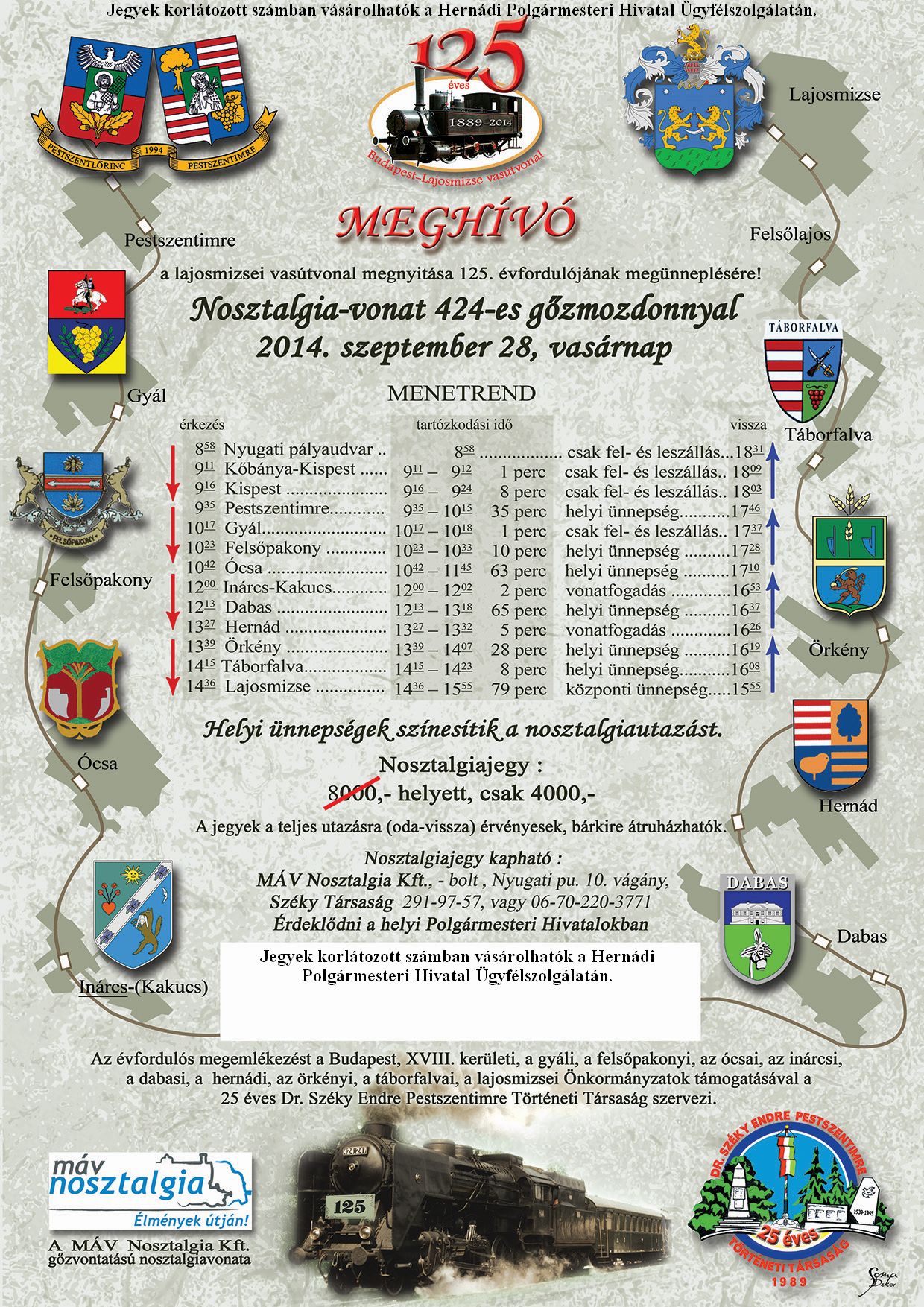 A Budapest-Lajosmizse vasútvonal megnyitásának 125. évfordulóján megint nosztalgiázhatunk. Szeptember 28-án (vasárnap) ismét ellátogat a 424-es gőzmozdony által vontatott nosztalgia-szerelvény Hernádra. Az alábbi plakáton olvashatják a menetrendet.