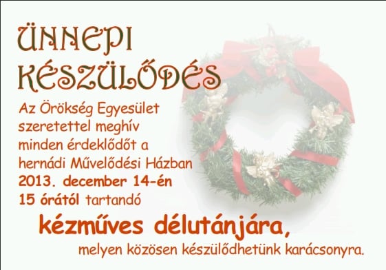 kkHosszú évek óta tartanak az örökség Egyesület kézművesei karácsonyi kézműves készülődést a művelődési házban. Az idén is megrendezik ezt a programot, amelyen a részvétel díjtalan. A részleteket a plakátra kattintva olvashatják.