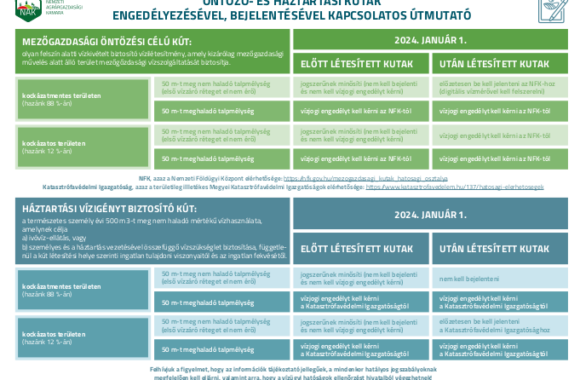 Az alábbi ÖNTÖZŐ- ÉS HÁZTARTÁSI KUTAK ENGEDÉLYEZÉSÉVEL, BEJELENTÉSÉVEL KAPCSOLATOS ÚTMUTATÓ táblázat segítségével, könnyen megállapítható az egyes kutakra vonatkozó előírások és esetleges teendők:
