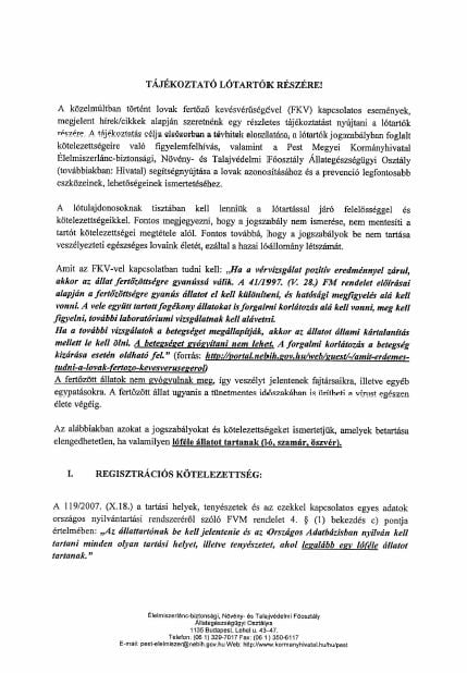 A képre kattintva a Pest Megyei Kormányhivatal Élelmiszerlánc-biztonsági, Növény- és Talajvédelmi Főosztályának tájékoztatóját olvashatják a lovak fertőző betegségével, az ún. kevésvérűséggel kapcsolatosan. Az anyag a lótartók számára elengedhetetlenül fontos információkat tartalmaz, ezért kérjük őket, hogy olvassák el, valamint hívják fel rá ismerőseik figyelmét is.